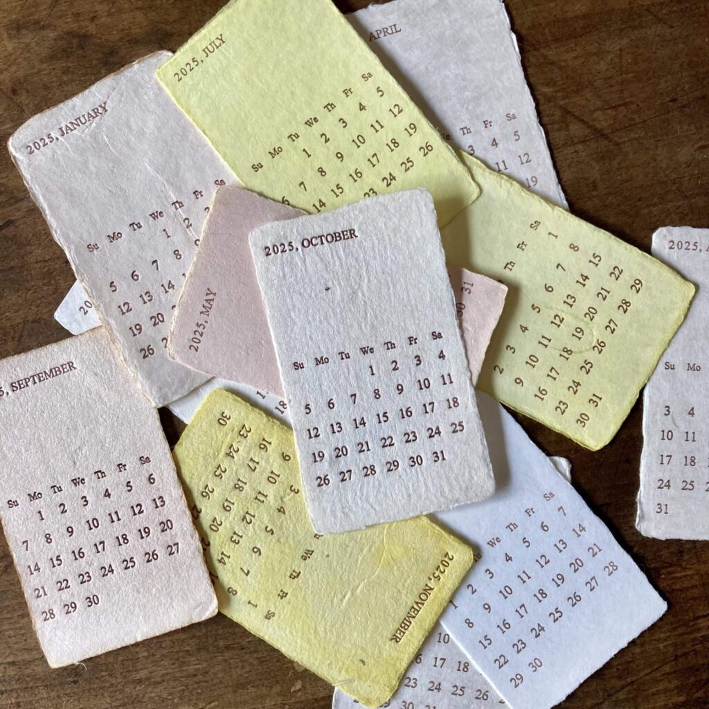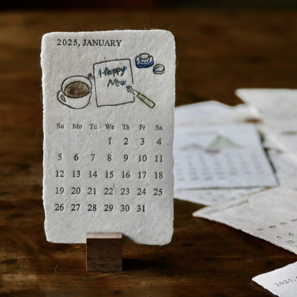 約55×91mmの名刺サイズの卓上カレンダーは、アボカドやお花で和紙を染めており、淡い色合いがとっても可愛いです。