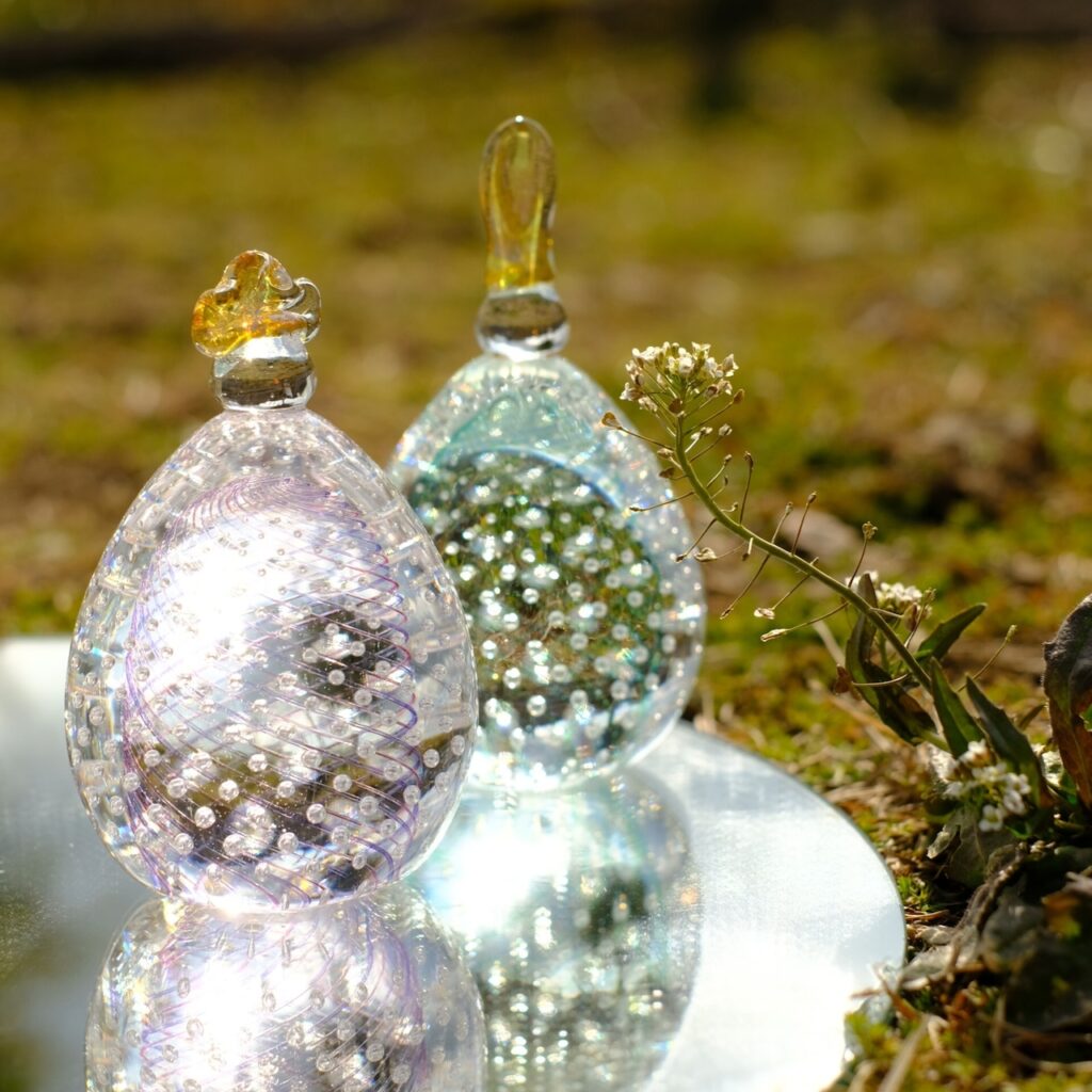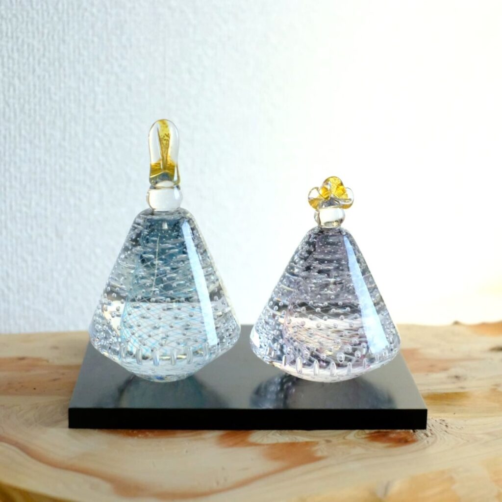 山口県にある小さな吹きガラス工房「ガラス工房マル」さんが制作されるお雛様は、気泡の入った可愛らしいコロンとした卵形です。